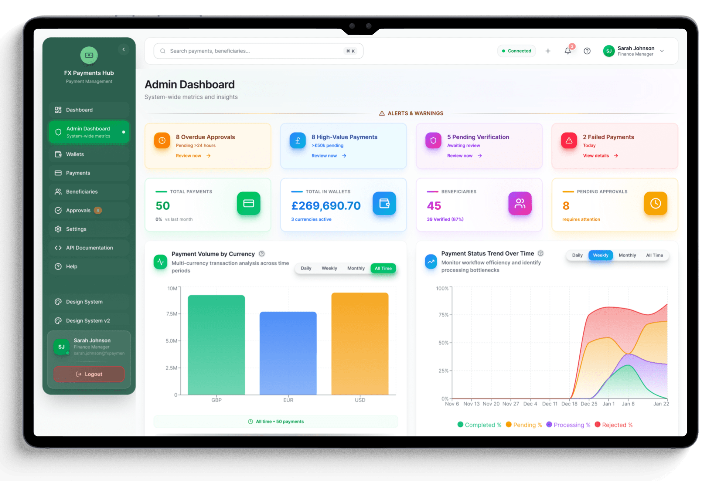 FX Payments Hub is a B2B web application designed for finance teams to create, approve, and track international payments with confidence. It balances surface simplicity with the complexity required for approvals, compliance checks, and auditability.